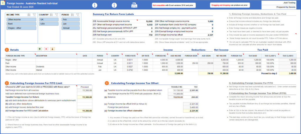 Use this calculator to help complete question 20 on the 2025 individual return. It replaces Foreign Income Tax Offset (FITO). The handy features of this workpaper include –
