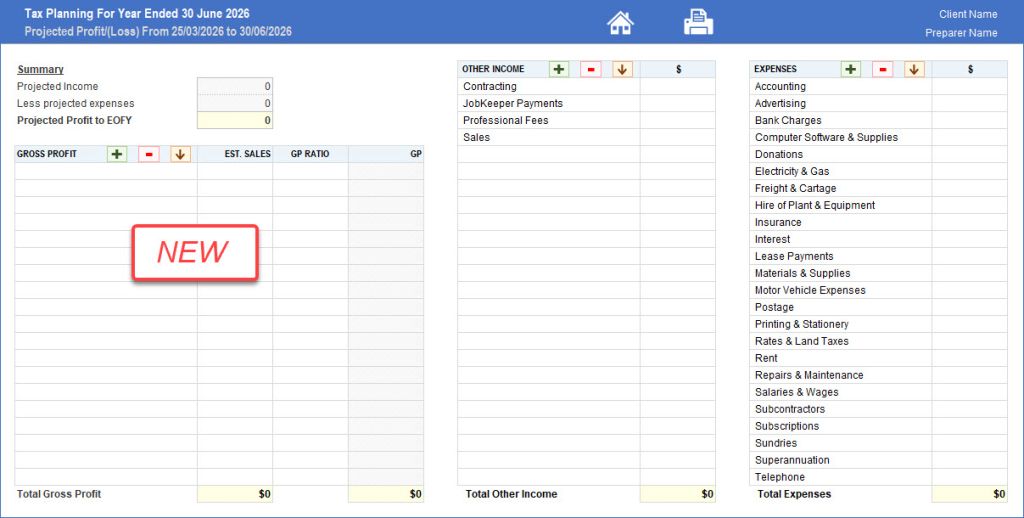 A gross profit calculator has been added to the projected income schedule to calculate gross profit from multiple trading activities.