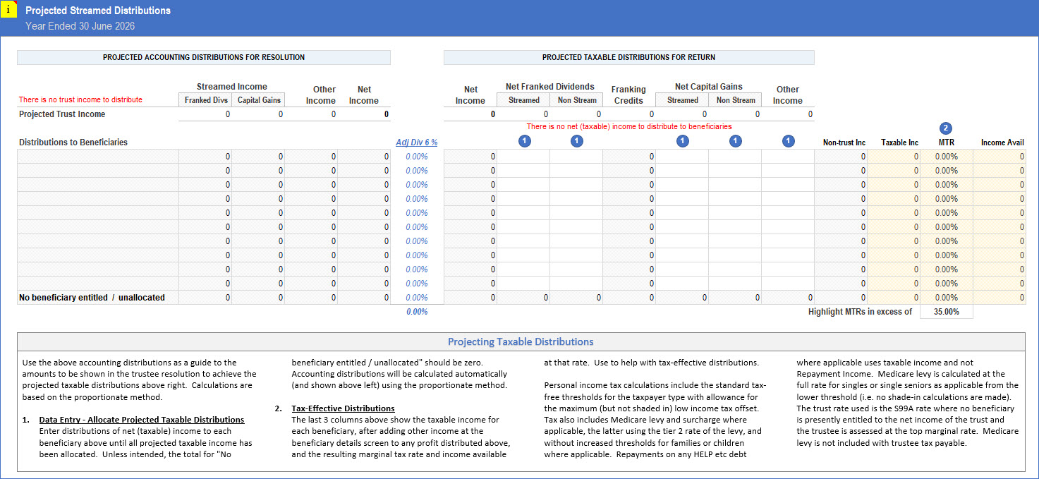 Using projected net (taxable) income for the year, you can view the marginal tax rates and income available at those rates for each beneficiary to make tax-effective distributions. The worksheet will convert those taxable distributions to accounting distributions for the trustee resolution.  The resolution forms part of this workbook.